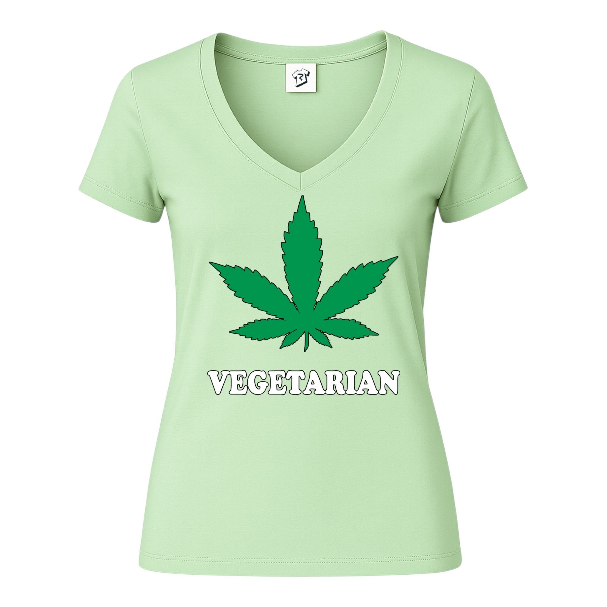 • Vegetarian V Neck Tee in light green with cannabis leaf graphic design, featuring the word 'VEGETARIAN' printed below